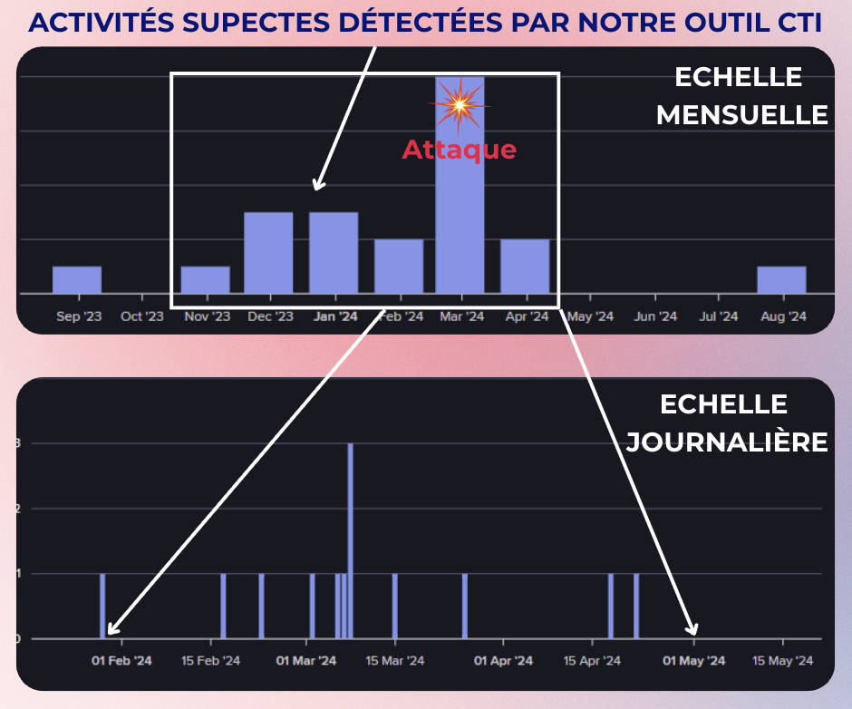 Ce schéma illustre notre capacité à détecter un pic d’activité suspecte sur une échelle mensuelle, puis à l’analyser en détail jour par jour pour comprendre précisément le déroulement de l’attaque.